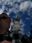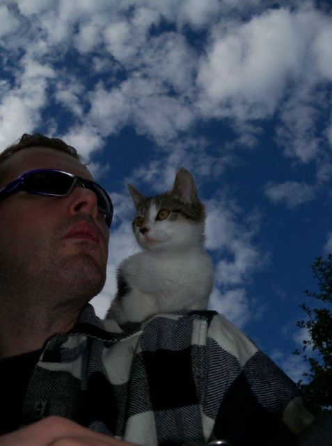 I'm pretty sure the specimen in the second photo is Felis catus on the shoulder of Homo sapiens.