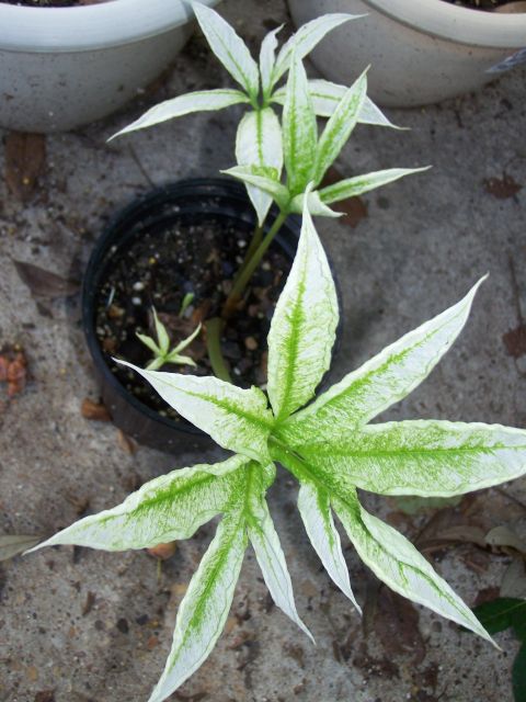 This is Amorphophallus Yuloensis, supposedly.  I bought two tubers from the same seller last year.  I potted both of them up at the same time.  One tuber grew as to be expected, nice an healthy.  This one started to grow spikes but then they got mushy.  I suspected the tuber was rotting so I pulled it up and to my surprise it was fine, it had nice roots.  I cleaned off the mushy spikes and replanted it.  About a month later it put out new spikes that looked normal until they opened up.  Each leaf exibits the same lack of chlorophyll.  It doesnt seem to be getting any as the leaves have been up for a few weeks now.  The plant looks healthy except for the obvious.  What do you think the chances are it will survive?  What are your speculations on the cause of this?  If this plant does survive do you think it is likely something that will be carried on?  Thanks for any insight, thought you all might like to see it in any case.
