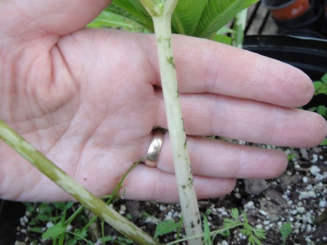 I wanted to share this odd pot of Amorphophallus bulbifer- Instead of the large-ish bulb putting up a big leaf, there were lots of smaller sized leaves, and one leaf, while otherwise normal, had an almost completely white petiole.