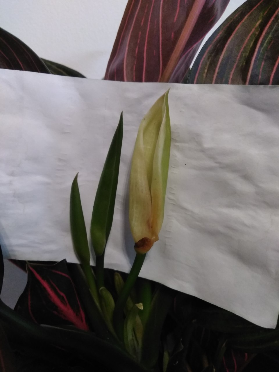 Sorry for the delayed response - I finally got a picture of the Aglaonema 'Chocolate' flower. The yellow doesn't come through very well on the camera with the lighting, but they are more of a creamy yellow than white.