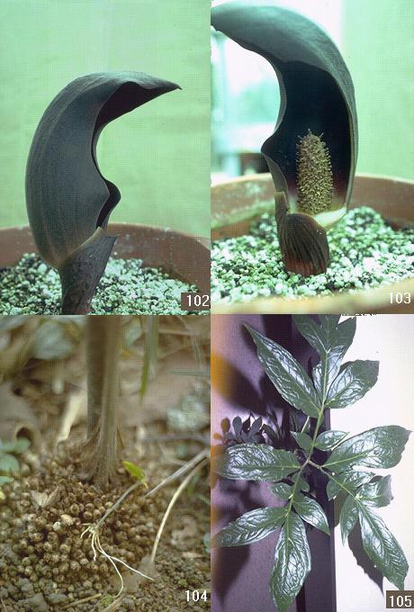 FIG. 102-105. Dracontium amazonense G. Zhu. 102. inflorescence (Zhu 1460). 103. spathe cut showing spadix (Zhu 1460). 104. tubercles (Croat 53561, photo Thomas Croat). 105. leaf (Croat 56898, photo Thomas Croat).