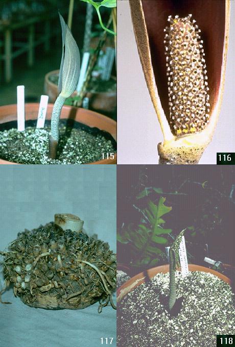 FIG. 115-118. Dracontium asperum K. Koch. 115. inflorescence (Zhu 1442, photo Petra Malesevich). 116. spadix (photo Wilbert Hetterscheid). 117. tuber and tubercles (Zhu 1445). 118. Juvenile leaf (Zhu 1445).