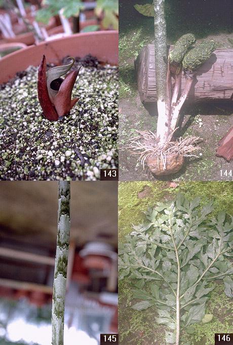 FIG. 143-146. Dracontium grayumianum G. Zhu (Zhu 1506). 143. inflorescence. 144. infructescences. 145. petiole. 146. middle division of the leaf blade showing highly divided segments.