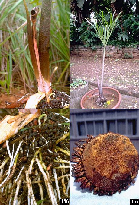FIG. 154-157. Dracontium margaretae Bogner. 154. inflorescence (Catharino 1832, photo Eduardo Luis Martins Catharino). 155. leaf (Zhu 1533). 156. tuber covered with roots (Catharino 1832, photo Eduardo Luis Martins Catharino). 157. tuber, bottom view showing tubercles growing on sides of the tuber (Zhu 1533).