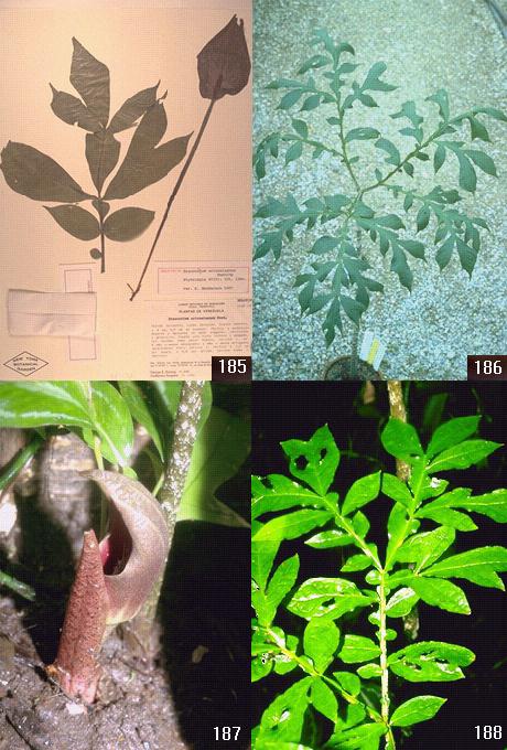 FIG. 185-186. Dracontium purdieanum (Schott) Hook. f. 185. inflorescence and leaf (Bunting 10866). 186. leaf blade (photo Thomas Croat #956-33).